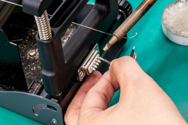 電線の芯線とコネクタ、ピン、または基板を合金を使って接合する重要な工程です。
